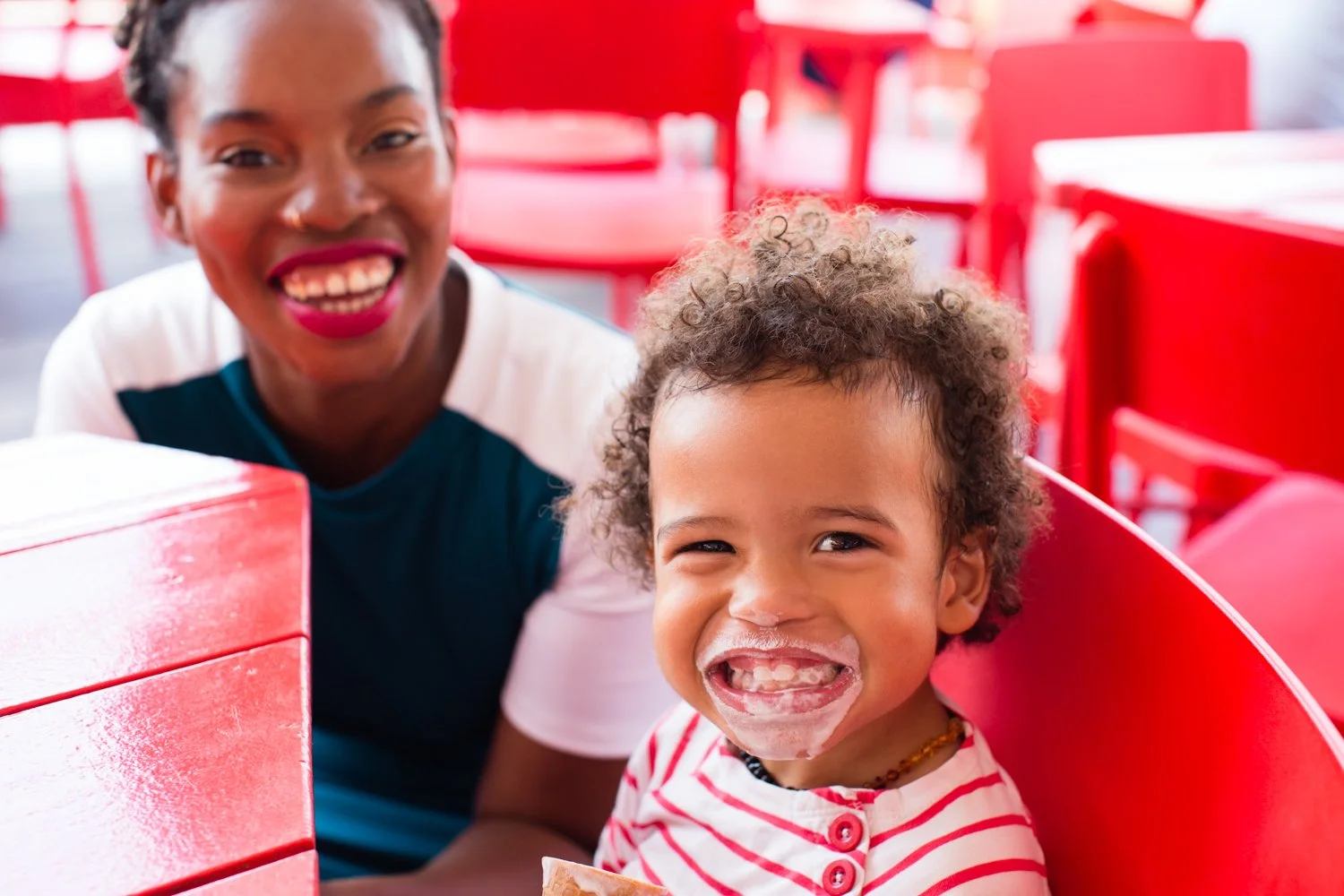 A woman and a young child smiling together at a red table in a brightly lit indoor space.