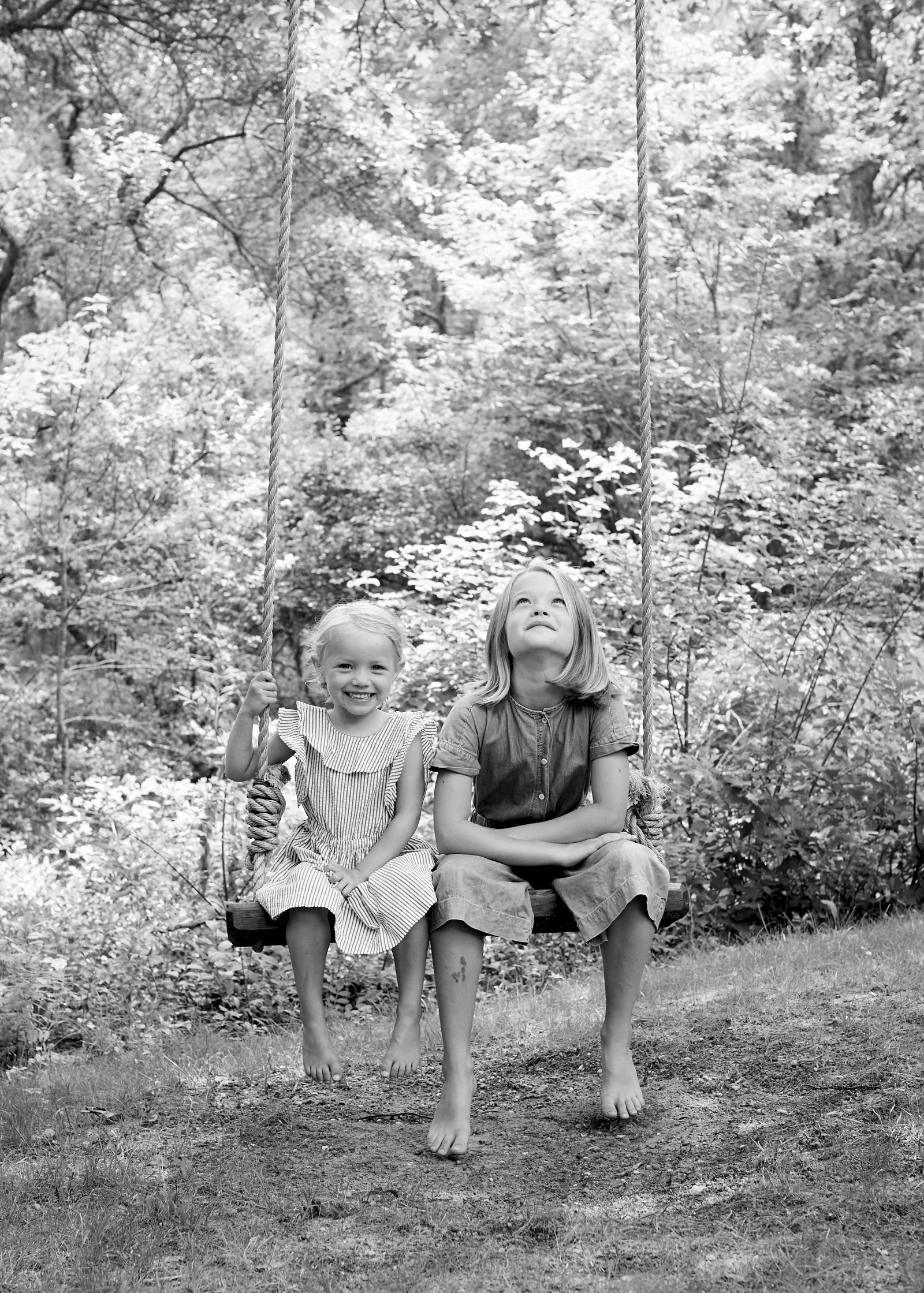 Two young girls sitting on a swing in a wooded area, smiling and looking up, in black-and-white. View fullsize