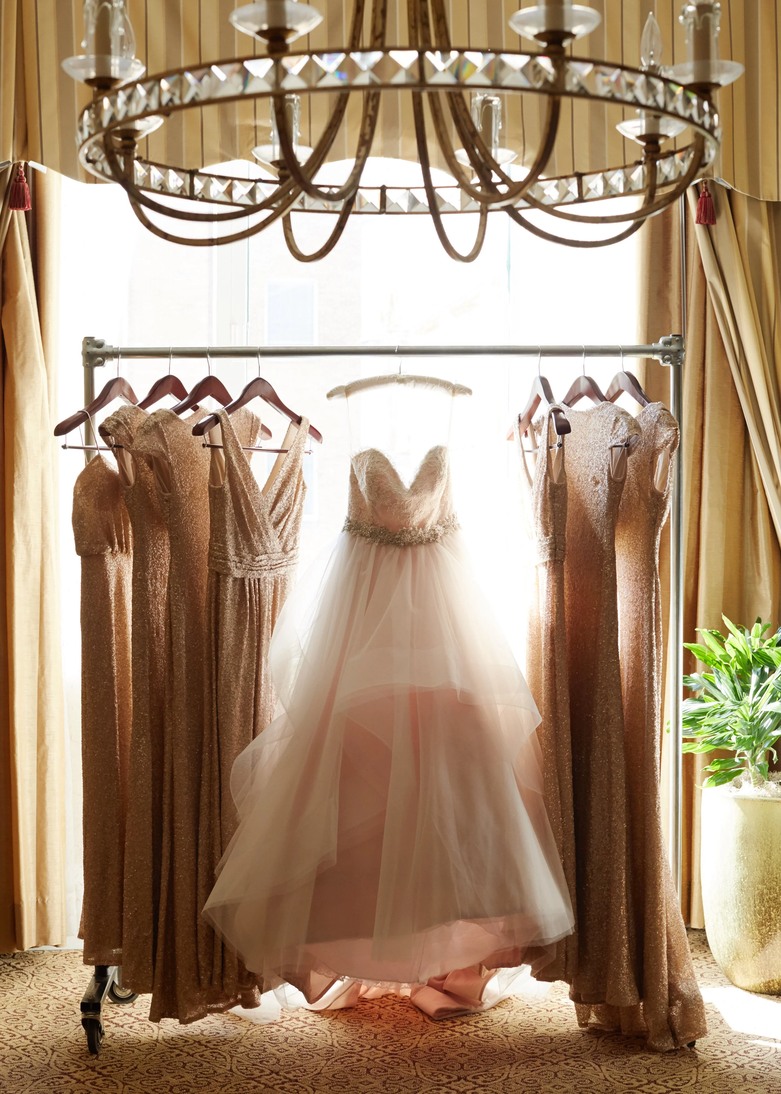 A wedding dress and four rose gold sequin bridesmaid dresses hanging on a rack in front of a bright window, with a chandelier above and a potted plant to the side. View fullsize