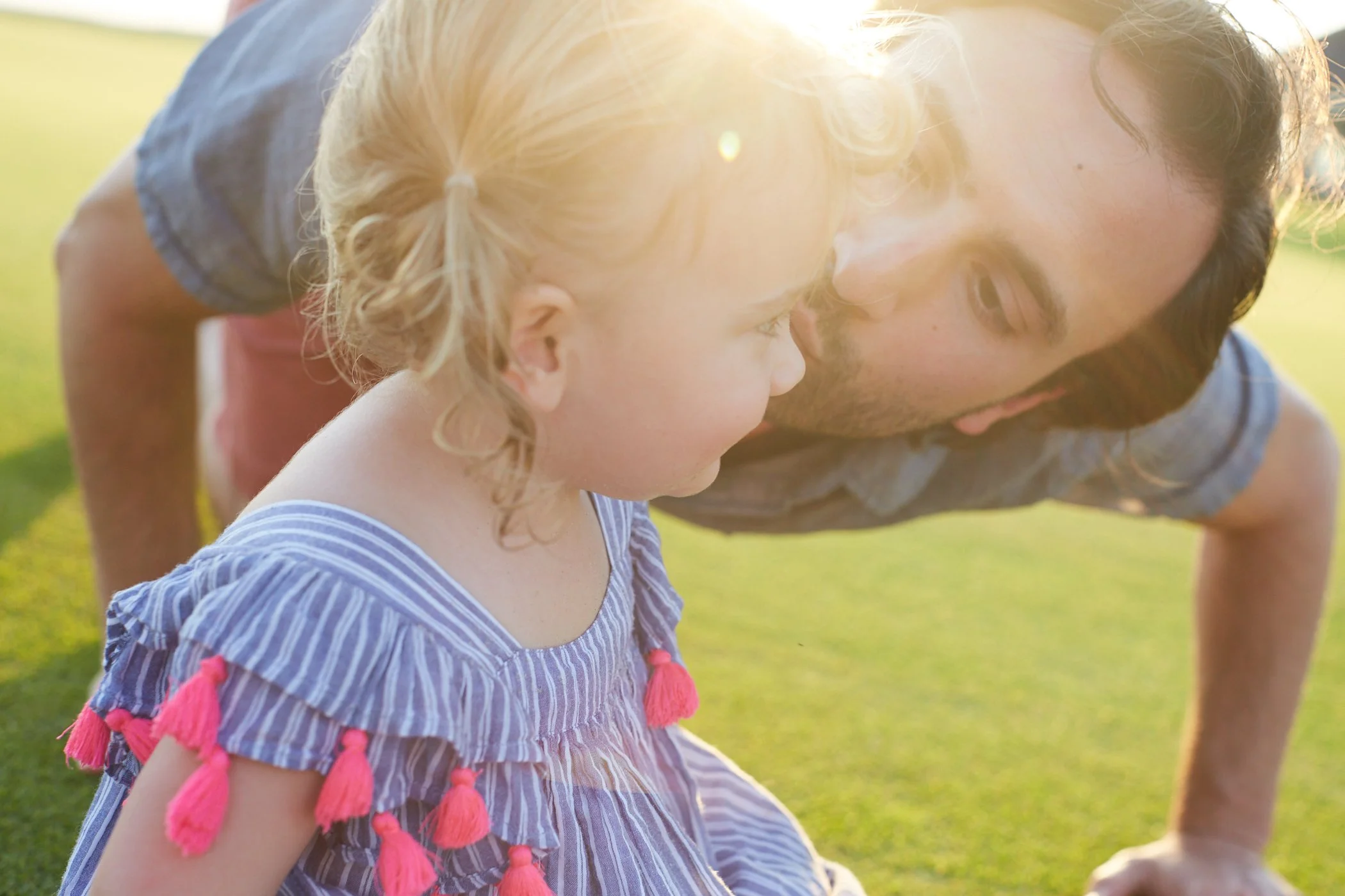 A man and young girl face to face outdoors, with the man leaning in close, sunlight shining behind them, on a grassy area. View fullsize