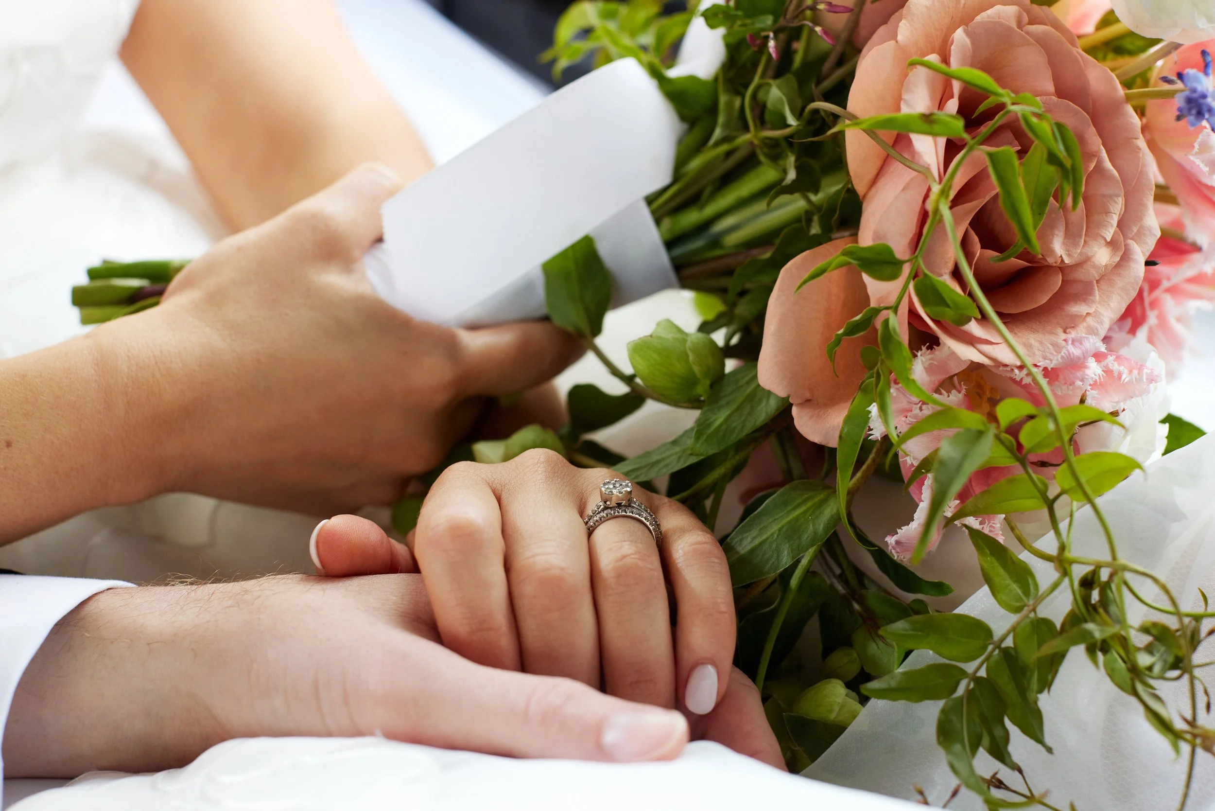 A couple's hands intertwined, showing their wedding rings, with a bouquet of pink and white flowers nearby on a white surface.