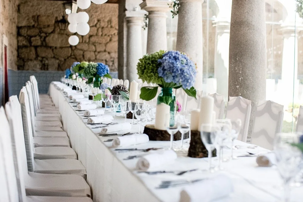 Elegant banquet table set for a formal event with floral centerpieces, candles, and glassware, in a bright room with stone walls and large windows.
